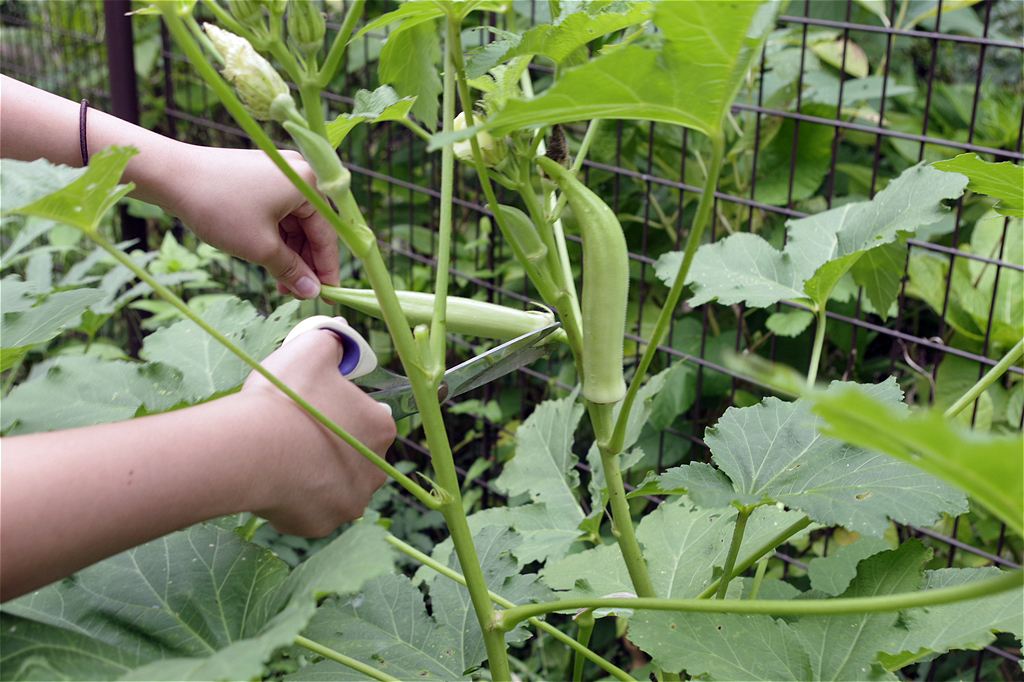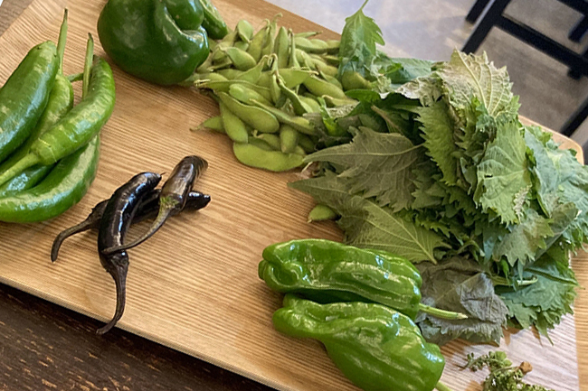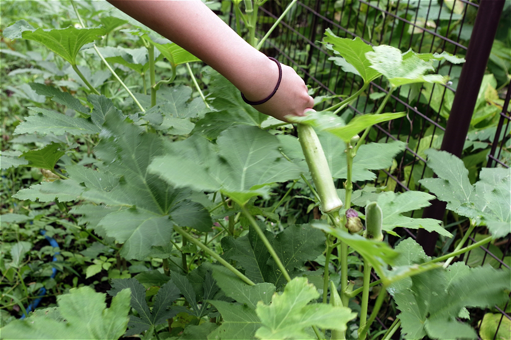 オクラやピーマン、 シソの葉、エダマメ、しし唐など実りの秋の収穫時期が一番楽しそうで、大きく育った野菜を見つけた時は、つい大声を出して、喜びを分かち合っていた |