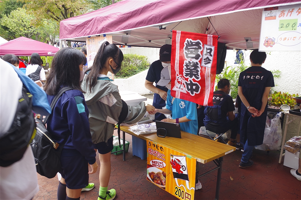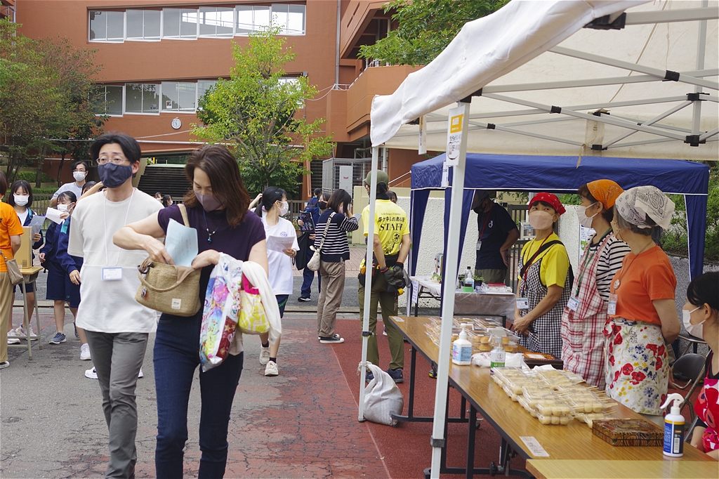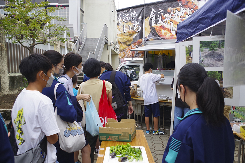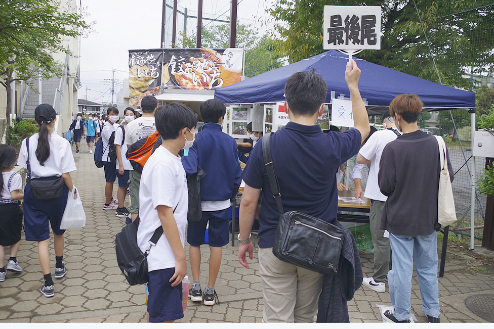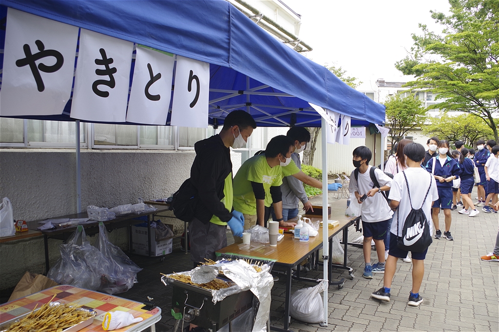 | 今回のふれあい祭は、規模を縮小し来場者も生徒とその保護者に限定しての開催との事。それでも凄い混みようであった。初めて模擬店に参加し「餃子のキッチンカー」で餃子の焼き上げをされた方は3時間休む暇なし状態であった。販売を手がけるスタッフ(生徒)の皆さんも同様で、仕事の大変さと責任感や充実感を体験され、いい思い出になったことでしょう。頑張れ新一年生! |