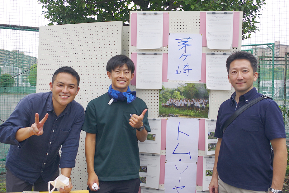 | 第一回目の茅ケ崎トム・ソーヤ活動に参加された池田先生(左)・加藤先生(右端)。現在茅ケ崎中学を離れていますが、友情応援として来校 |