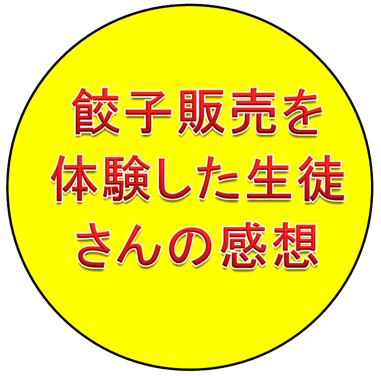 ●トム・ソーヤ活動に参加でき、いろいろな人達たちと協力し餃子が沢山売れ、美味しかったと言われ嬉しかった。●販売コーナーで待つお客様にジャンケンゲームをし、コーナーが楽しく盛り上がって良かった。●餃子販売のPRチラシを受け取ったお客さんから、「食べに行こう」と言う声を聞いてやりがいを感じた。●自分たちで作った野菜が餃子商品となってお客様に届いて嬉しかった。●餃子以外の料理にして提供したい。●PR用チラシをなかなか受け取ってくれなくて大変でした。●商品の説明や接客が大変でした。●餃子の販売をしたことで、多くの人に「茅ケ崎トム・ソーヤ」の活動を知ってもらえたと思います。●同じクラス、同じ部活の人だけでなく沢山の人と交流出来た。●販売終了後に全員で餃子を食べたのが一番楽しく、みんなで協力したからやりがいも感じた。●餃子の販売はとても長い行列ができていて、沢山の人が茅ケ中の野菜を食べてくれたことに驚いた。●これからも美味しい野菜を育てていきたい。 |