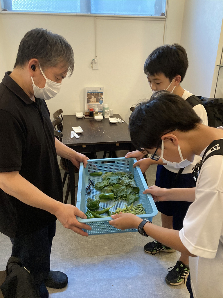 校内で育てている取り立ての新鮮野菜を餃子購入のお客様にプレゼントするため朝一で摘み取っていた。 |