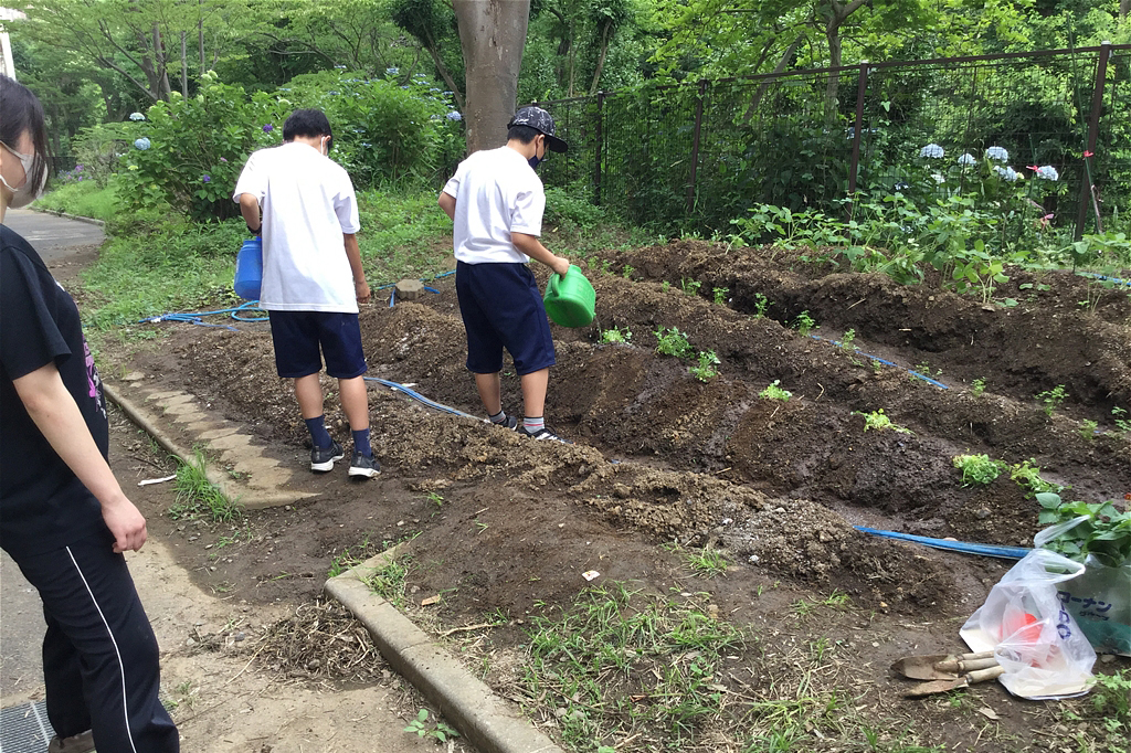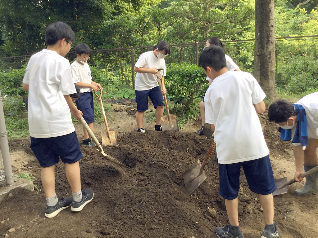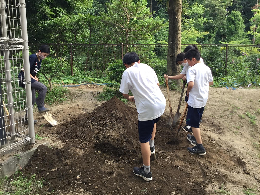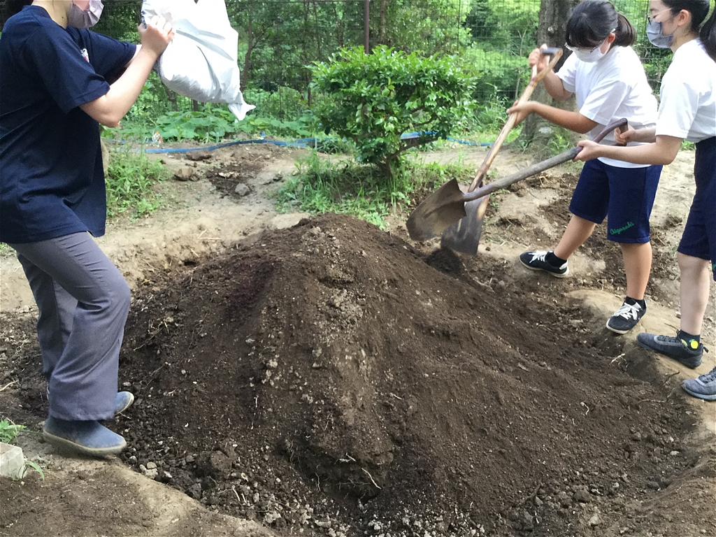 皆で力を合わせ、水と肥料を加え何度も混ぜながら良質の土壌にしていった |