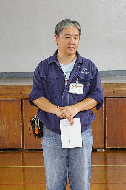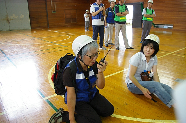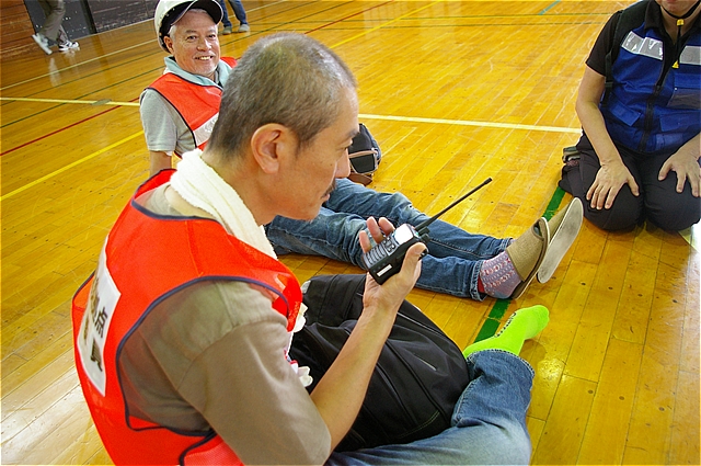 | 横浜市アマチア無線非常時通信協力会都筑支部の馬場さんにより避難所開設宣言を区役所へ連絡。区役所との連絡の実演(被害状況・けが人など情報の共有) |