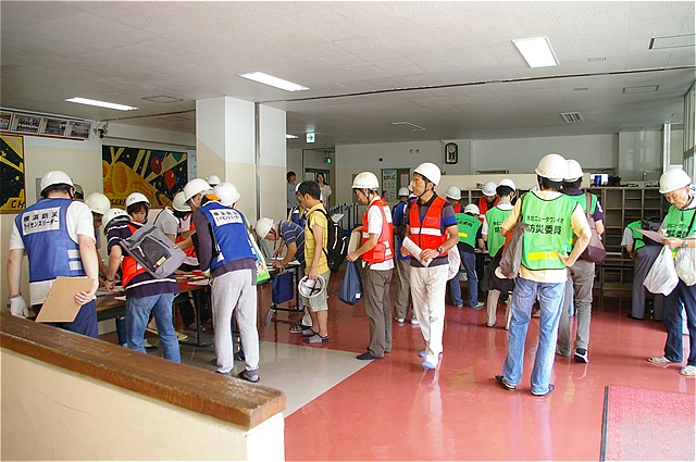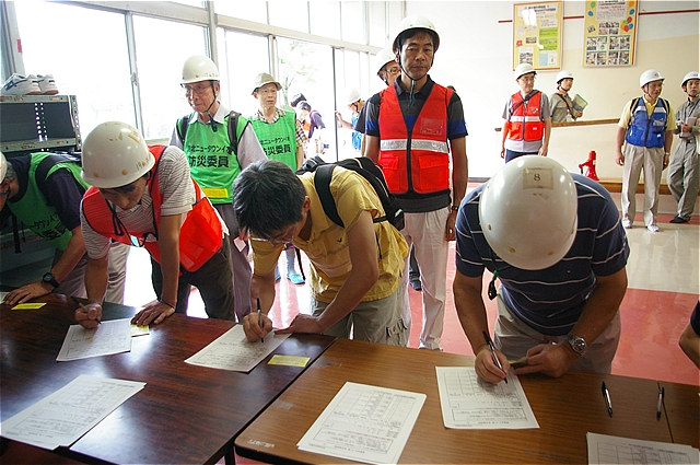 | 避難してくる各該当マンションの住民を想定した、受付の開設と避難カードの記入 |