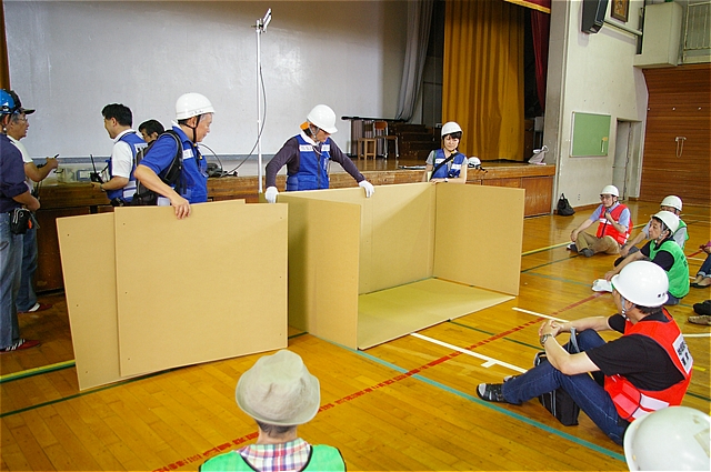 「避難所を開設し、被災者を受け入れる」までの本番に即した訓練は、シナリオや役割分担など事前の打ち合わせなどなく行われた。それは、発災を想定して各自が何をすべきかを考え、それを体で覚え、いざという時でも慌てずに行動できることをゴールにしているとのことでした。 |