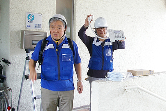 | 地域防災拠点と各マンションの災害対策本部との被害状況の確認は簡易無線機で行う。 |