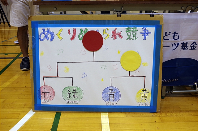 赤・黄・青・緑のチームが競い合い結果は赤組チームが優勝。 |