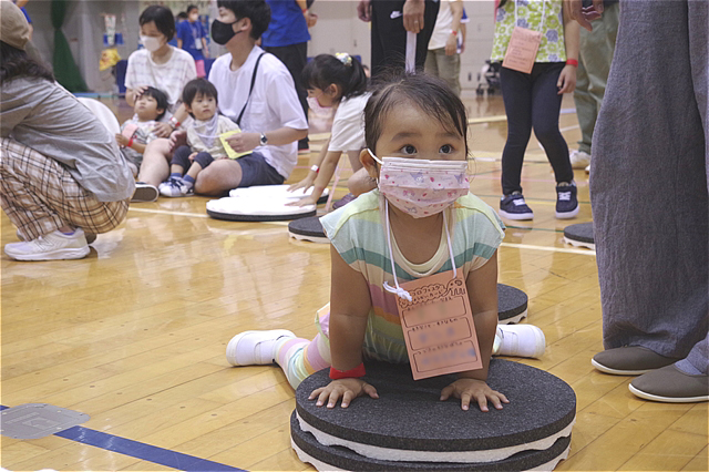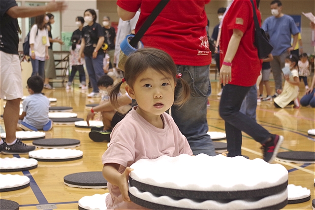 同じ色のチームで集まり、巨大オセロをめくって、めくられて、赤・青・黄・緑チームの対抗戦が行われた。司会者(栗原さん)のスタートの合図を対戦チームがまだかまだかと、気持ちを高ぶらせて待っていた。合図の瞬間に飛び出すのは、やはり子供たち。しかし必死さは保護者のみなさんも負けてはいませんでした。