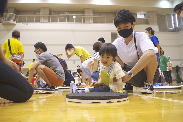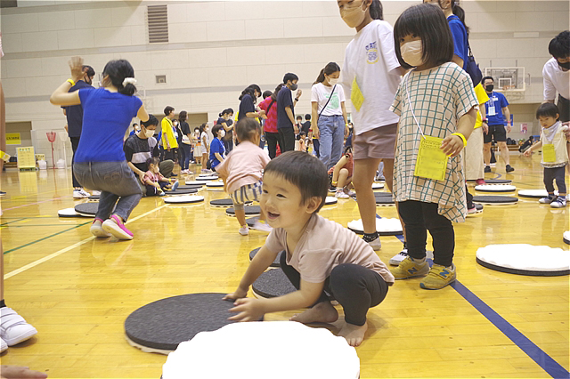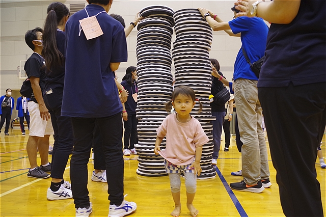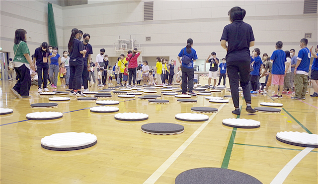 参加者のみなさんは、4チーム(赤・青・黄・緑)に分かれ、その中に障がいのある子や車いすでの参加者、外国籍のお子さんたちもいてお互い紹介しあったり、協力しあいながらチームで好きな場所で自由に遊ぶことができ、みんなで面白いことを思う存分楽しめる時間を作っていた。 |