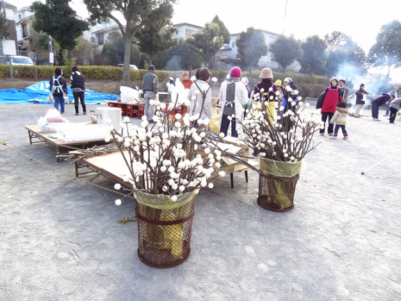 寒いながら晴天に恵まれた前倒しの小正月、300人を超える人が集まり盛大などんど焼きであった