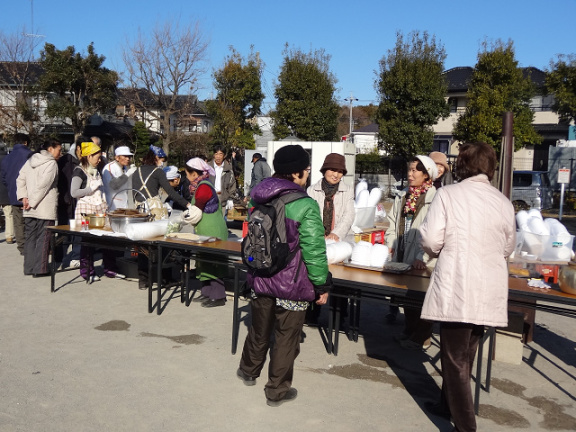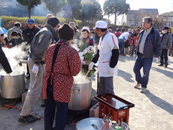 熱々の豚汁。寒い時はこれが一番。今年は甘酒の代わりに、住民の要望で豚汁となった