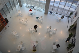 小林市長のもと、「八戸市中心街振興観光交流施設」の設計者を公募。2007年に針生承一建築研究所が選ばれた。 針生承一さんは、横浜都筑文化プロジェクトのメンバー江幡さんのご主人と大学の建築科で同期である。このご縁で、研究所がある仙台から横浜の都筑まで講演に来てくれたのだが、今回の八戸視察でも、はっちの見学はもちろん、横丁めぐり、翌朝の朝市にも同行。八戸の町づくりに何年も関わってきた針生さんならではの案内をしてくださった。視察が充実したものになったのは、ひとえに針生さんのおかげである。 開館は2011年2月11日。この数字を合計すると8になる。このように、はっちは8にこだわっている。8へのこだわりは、次の3枚の写真でもお分かりだろう。はっちの愛称は公募で決まった。八戸の「はち」が「はっち」になり、英語で「出入り口」や「孵化」を意味するハッチにもちなんでいる。