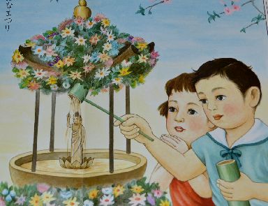 市販の甘茶は、添加物などが入っていることが多いが、ここのはもちろん無添加。会員たちの手作りで、心がこもっている。こんな甘茶をかけられたお釈迦さまは喜んでいるに違いない。 「ところで、どうして甘茶をかけるんでしょう」 「釈迦がお生まれになったのを喜んだ水の神の使いである竜王が、甘くて清らかな雨(甘露)を降らせ、その雨で産湯を使ったという伝説にもとづいています」 「なんとなく知っていた花まつりですが、奥が深いですね」
