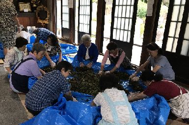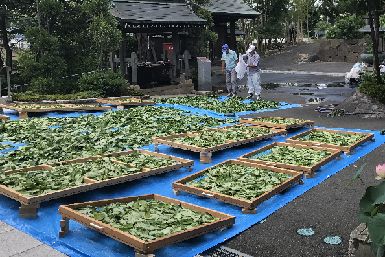 「数年前の夏の暑い日に、甘茶の葉を摘む作業を見る機会がありました。甘茶の木がどんなものか気にもしていませんでしたが、ガクアジサイにそっくりなんですね」「甘茶の木はユキノシタ科。ヤマアジサイの変種です。見た目はアジサイと同じですね」(左) 「甘茶つくりの1年間の作業を教えてください」 「2月末から3月上旬は除草や剪定。6月下旬から7月上旬にも除草をします。そして7月中旬から下旬に甘茶の葉を摘む作業をします」 「葉を洗って天日干し。乾いた葉を水を含ませながら揉みます。再び乾燥させます。出来上がった葉は茶箱に入れて保存します」 「毎年5月には京都を訪れます。浄土宗の総本山の知恩院と大本山の黒谷金戒光明寺に、この甘茶を献納してきます。とても喜ばれていますよ。甘茶の会々員15名ほどが参加しています」 以下の写真は「甘茶つくりの1年」。石川住職に提供してもらった。いずれも2017年撮影。
