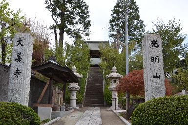 気さくにインタビューに応じてくれた石川住職は、2013年の秋に28代に就任した。28代といえば相当古い。「大善寺は浄土宗ですね。いつごろ開いたのですか」 「時期については確定できる資料が見つかっていませんが、江戸時代の初期に大阿善達和尚(だいあぜんたつかしょう)が開山したと伝えられています」 左写真は光明山大善寺。急な階段を上ると本殿がある。 「甘茶の会があると聞きました。いつ頃できたのですか」