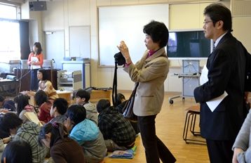 カメラを構えている毎日新聞社 編集編成局 生活報道部のK記者 。この授業とは別に、荒武さんと高橋さんにインタビューしています。当日も数人の子どもたちに、授業の感想を聞いていました。 |