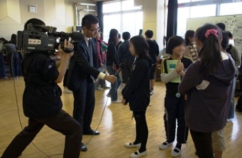7日に取材にきたNHKの記者とカメラマン。8月の終戦記念日特集で荒武さんの番組を作った記者が、この日も来てくれました。出前授業の感想を、インタビューしているところ。 |