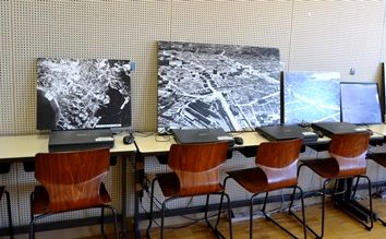 クラスごとの授業が行われた視聴覚室に、パネル写真などを展示しました。スマイル発信隊のスタッフが、横浜市西区にある「横浜市史資料室」まで借りに行きました。空襲直後の焼野原やB29による爆弾落下などの貴重な写真。話が終わったあとに、子どもたちは熱心に見ていました。 |