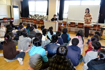 話が終わったあとも、質問攻めにする子どもたち。質問が長引いて、次の授業時間になってしまいましたが、「関心を持ってくれて何よりです。生の声を聞ける機会は、非常に貴重ですから」と、1組のW先生。子どもたちが気が済むまで、先生は、ゆっくり待っていました。 「子どもたちがこんなに熱心に聞いてくれるとは、予想もしていませんでした」と、涙ぐむ荒武さん。 |