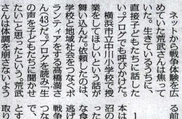 ”つなごう人の輪””さがそう魅力”が、交流ステーションのモットーです。今回の「区民レポーターが行く」の取材は、中川小学校6年生の社会科授業。人の輪がつながったことで、この授業は実現しました。 ”ひと”訪問15回目の高橋満さんは、地域と中川小学校をつなぐ「学校教育支援ボランティア(スマイル発信隊−左−)」の世話役をしています。そして16回目の荒武千恵子さんは、横浜空襲を経験しています。2人の活躍は、ひと訪問をお読みください。荒武さんを訪問したのは、8月の終戦記念日のころ。「生きているうちに、戦争中のつらい日常や空襲の体験を若い人に伝えたい!平和の素晴らしさを知ってほしい!」と熱く語りました。 この思いを実現するにはどうしたらいいんだろう?「そうだ、スマイル発信隊に頼んでみよう。歴史を習っている6年生に、生の声を伝える絶好のチャンスになるのではないか」と思いつきました。 この思いつきが、とんとん拍子に実現。中川小学校6年生の2組と1組(12月5日)、4組と3組(6日)、5組(7日)の授業で、クラスごとに話をさせてもらえることになりました。真珠湾攻撃ではじまった日米開戦は1941年の12月8日。ちょうど開戦70年にあたっていました。 体験談を話し終わった荒武さんは、「どうしてもみなさんに言っておきたいことがあります。兵隊さんばかりでなく、子どもたちさえ、こんなにみじめな思いをしたんですよ。戦争になったら大変。始まりそうになったら、まず大声で反対しましょうね!」と、子どもたちに呼びかけました。 この授業が成功したのは、スマイル発信隊のメンバー(高橋さん・阿部さん・大西さん・貞末さん・校長・副校長・教務主任)、6年生の先生方、荒武さんとの、数度にわたる話し合いがあったからこそでした。 5日の授業には、毎日新聞生活報道部のK記者が取材に来てくれました。7日の毎日新聞は、8段を割いて「80ばあちゃんブログ発信」というタイトルで、荒武さんのブログと出前授業の様子を伝えています。 7日には、NHKの記者とカメラマンも来校。テレビの首都圏ニュースやラジオのニュースで、発信していました。 以下、社会科授業の様子を写真でごらんください。 (2011年12月 取材 HARUKO記) |