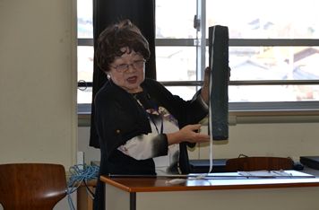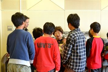 「私は81歳のしわくちゃギャルです」。「最近のお子さんはみんなカワイイですねえ」「みなさんに会えてほんとうに嬉しいです」。 最初のこの三言と荒武さんのチャーミングな笑顔によって、70歳の年齢差がいっきょに縮まりました。 |