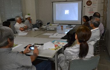 交流ステーションで埋蔵文化財センターを取材した時に、都筑区は横浜市の中でも飛びぬけて遺跡が多いことを知りました。そのうち80%以上を占めるのが縄文遺跡です。 その意味では珍しくもないのですが、この図の南堀貝塚は、ニュータウン開発の15年以上前の1955(昭和30)年に発掘されました。考古学上、非常に意義がある発掘と言われています。 つづきアーカイブクラブ(TAC)-荒井眞一郎会長-は、ニュータウンの開発で、散逸しがちな資料をアーカイブとして残すことを目的に活動しています。 会員の知人・北村博さんが南堀貝塚発掘時の映画を手に入れたこと聞き、上映会を開くことになりました。 上映会と座談の様子を、取材してきました。 南堀(みなんぼり)貝塚が発掘されたのは、1955(昭和30)年の夏です。 早淵川の北、標高45メートルの台地で、縄文人たちが生活していたことが分かりました。上の想像図にあるように、台地の下には海が迫っていて、背後は山。海の幸にも山の幸にも恵まれた地でした。 今の住居表示では、南山田3丁目40番地あたり。残念ながら住宅地になっていて、当時の面影はありません。記念碑すら建っていません。遺跡もすぐに埋め戻されたと聞いています。 竪穴住居址48、落とし穴、炉穴、縄文土器、石器、貝塚、動物の骨などが発掘され、縄文時代前期の遺跡だと分かりました。住居は広場を囲んで半円状に分布しています。下の写真は映画上映の時に撮影したので、クリアではありませんが、発掘した遺物の一部です。