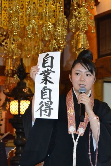この日のクライマックスは、光誉祐華(こうよゆうか)師による仏教伝道ライブだった。奈良県の吉野にある浄土宗西迎寺の副住職。黒い袈裟を着ていなければ、僧侶とは想像すらできない。 おおかたの日本人は、お寺は仏事の時しか行かない。仏教の教えを知る人も少なくなくなっている。西迎寺の娘に生まれた光誉祐華さんは、 仏教大学で学ぶかたわら、歌手になりたいとボイストレーニングにも励んできた。 「仏さまの教えを、みんなに知ってもらいたい。若者と仏さまの縁を結ぶ架け橋になりたい」と、平成19(2007)年から仏教伝道ライブを始めた。「愛$菩薩(あいどるぼさつ)」と言う名前で、ライブハウスにも出演している。