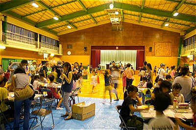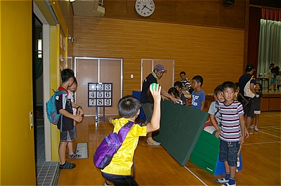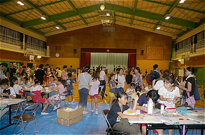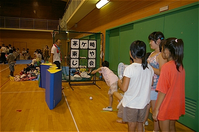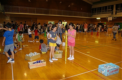 体育館では、@空き缶積み、Aうちわ作り、B風船レース、C頭でキャッチ、Dわなげ、E輪ゴム鉄砲Fストラックアウトなど7種類の遊びが行われておりました。