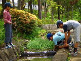 と、何やら真剣な“男3人組”これは 懐かしい!糸の先にするめを付けて ザリガニ釣 をしていました。 プラスチックの容器には、迷惑そうに 釣られたザリガニが固まっていました。 |