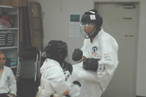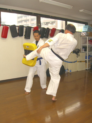 続いてミット打ちの蹴りの稽古。 前蹴り、回し蹴りと、力強い音が道場一面に響き渡る。 |