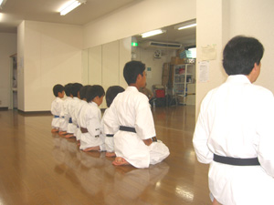 正面に対して礼をした後、 宗家岡田先生、指導者に対して、 さらには父兄の方々に礼が続く。 |