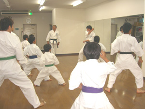 | 初めは基本の型の稽古から。 | 皆で声をかけながら力強い型の練習が続く。 | ||
