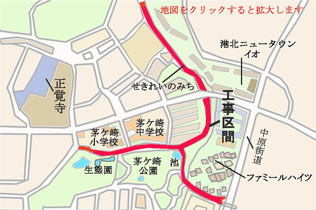その『せきれいのみち・茅ケ崎公園』は、長い年月が経過しており、再整備の時期を迎え2020年8月17日〜2021年2月12日の予定で都筑土木事務所が一部改修工事を実施している。