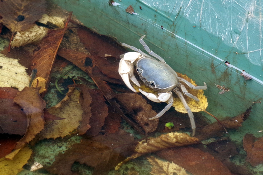 レアな水色系のサワガニが見つかった。