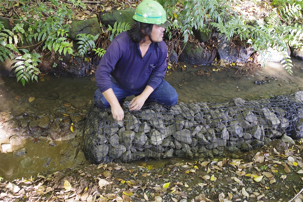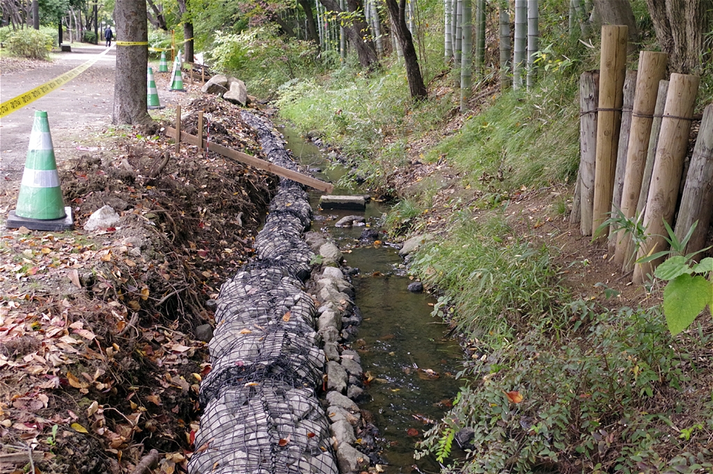 蛇籠で小川をなだらかにし、水の流れを良くしている |