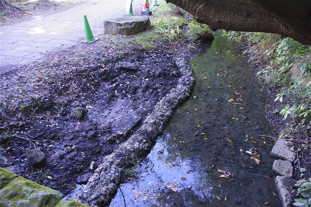10月28日(水)茅ケ崎公園の緩やかな斜面の先つながる池の淵は、長年にわたり堆積した泥を取り除く作業(浚渫)を計画しておりました。当日施工会社である(株)きたむら園は、地域貢献活動の一環として、住民(生徒)との交流の機会を設定し、茅ケ崎中学校の生徒さんに、池の浚渫作業のお手伝いを通して仕事の体験と共に、池に棲む生き物を発見したり、水質や環境の実態を調査分析するなど、中学校の課外活動としての場を提供し、午後3:30〜4:30頃まで行われた。