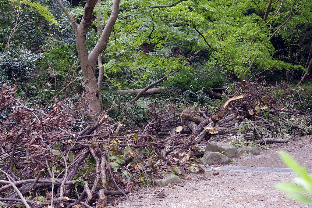 伐り出された枯れ木はあっという間に、緑道に積み上げられていた。 |