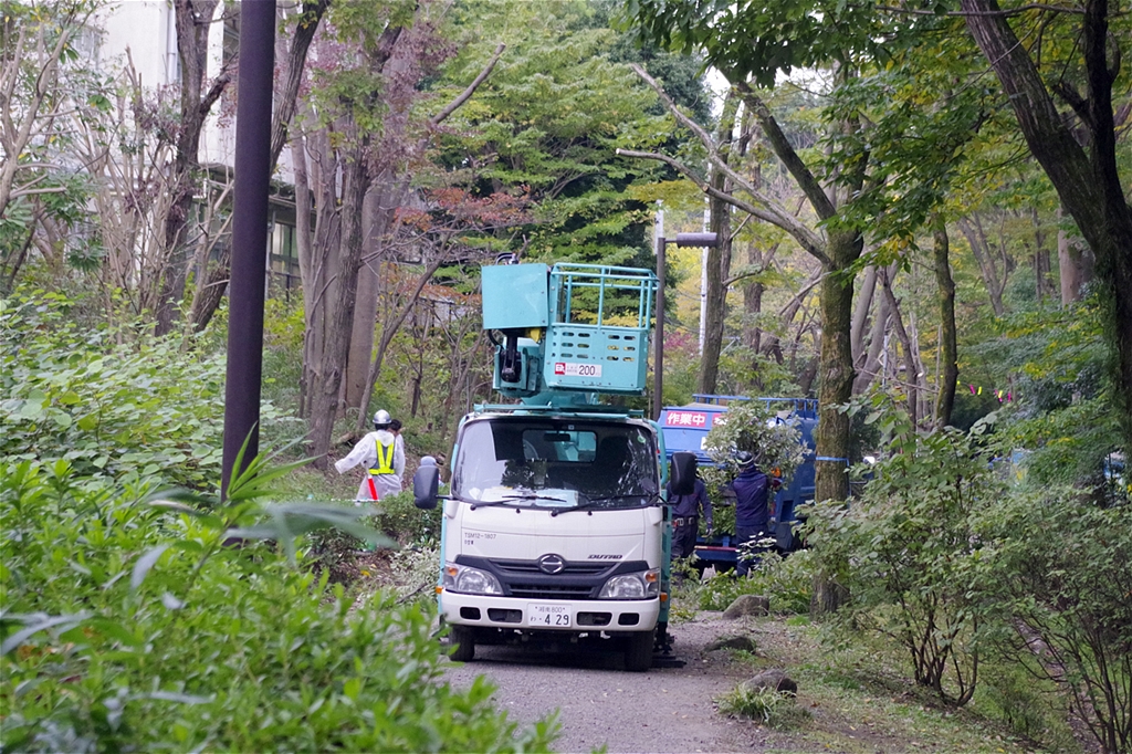 景観を損ねないよう、多くの造園業のプロの皆さんが、クレーン車を操り高い所や山の斜面、平地の枯れ木の伐採や太陽の光をあてるための剪定作業に安全を確保しつつ取り組んでいる。 |