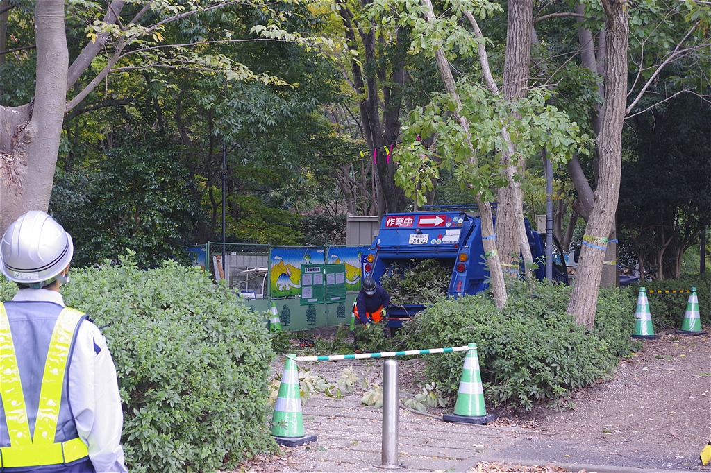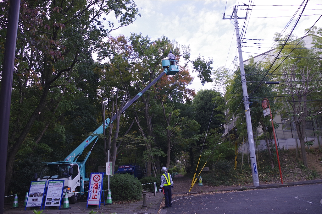 緑道には高い木の剪定に大型クレーン車を入れているため、学校の下校時間帯は児童や生徒の皆さんの安全確保のため最大限の注意をはらい作業を行っていた。
