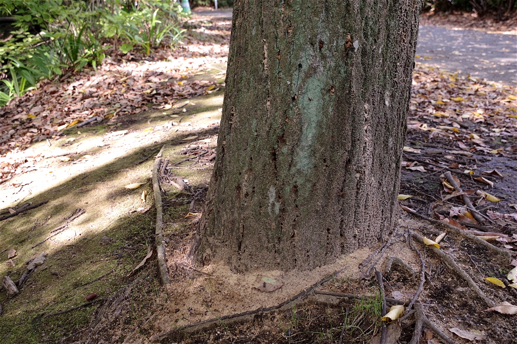 | これは『ナラ枯れ』の被害にあっている木である。体長5ミリほどのカシナガ虫が、ナラ類などの木の幹に入り込み、ナラ枯れの原因となる「ナラ菌」を繁殖させる。根本付近に繁殖により排出された木屑が見られる。木の伝染病。 |