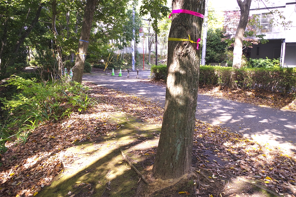 | 伐採の木は、ピンクのテープが目印。 |
