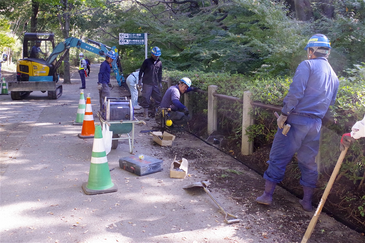 | 緑道とは言え 人通りは多く神経を使う作業 |