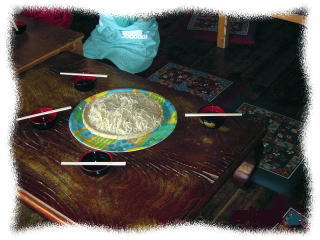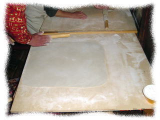 地のし、丸出しのし台に打ち粉をふり練り上げた塊の生地を全体が円形になるように手のひらで延し、更に麺棒を使って直径40〜50pまで延す 初心者には丸く均一な厚さにすのが難しい。 |