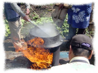 釜ゆで裏庭の特設大釜、 たっぷりの量の熱湯で少量の麺を一山づつ手早く茹でる。 沸騰した熱湯にバラバラにほぐしながら入れ、20〜40秒で茹で上がり。素早く冷水で冷やして出来上がり。 茹ですぎるとコシがなくなりおいしくない。 |