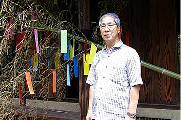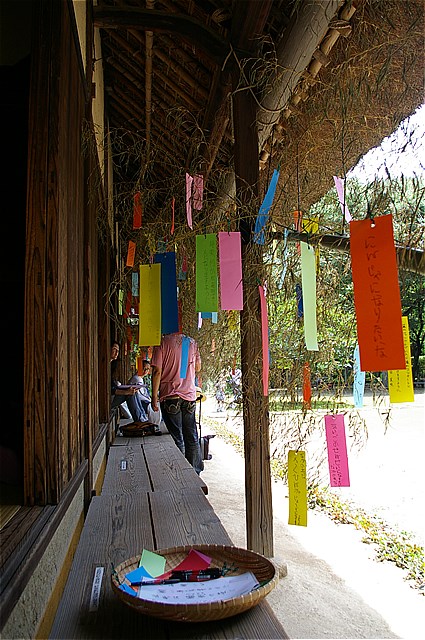 民家園の縁側に2本の大きな竹が飾られており、園に訪れる人たちに色とりどりの短冊が用意されていて、願いを事を書いて