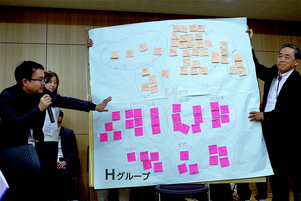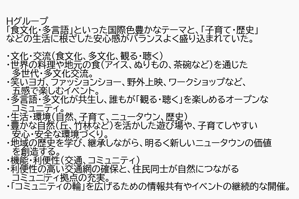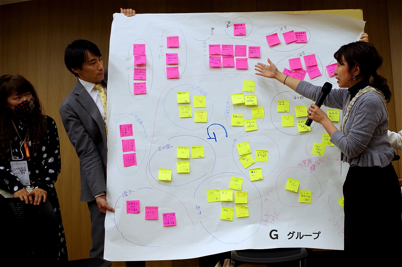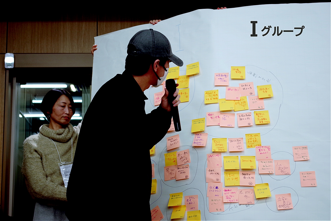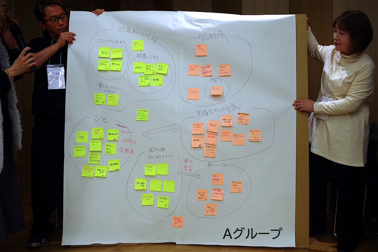 A〜Jグループまでの10グループ分かれ、80名の熱気あふれるディスカッションが始まり、その後グループごとの素晴らしい発表会がくり広げられ、皆さんの「街への想い」がより鮮明に伝わった発表であった。