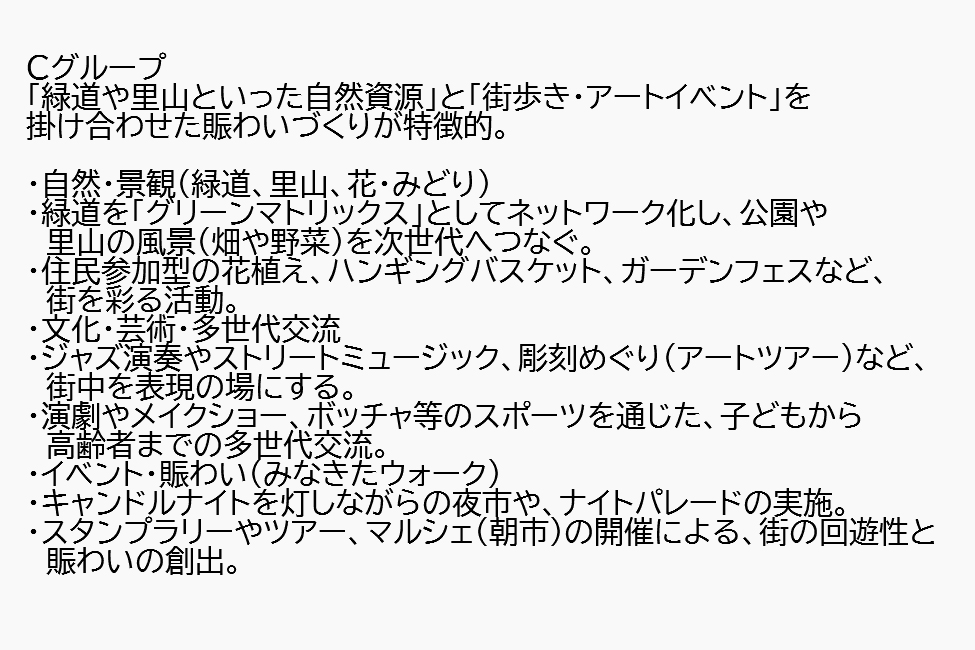 | 遊歩道が充実。子供が育てやすい。子供アーティスト応援。ドイツ人アーティストとコラボイベント。 |