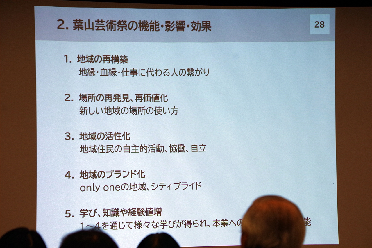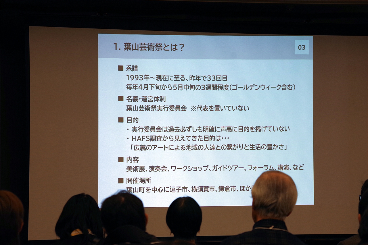 葉山町周辺の住民により自主自立的に、2026年34回目を迎える「葉山芸術祭」。 地域発住民主体アートプロジェクトが地域生活を豊かにしている取り組みを聞くことにより、都筑らしさを創造する文化芸術プロジェクトの意味・意義を見出すのため、街の生い立ちや生活環境など異なるが、参考になるキイワードが沢山あったようだ。