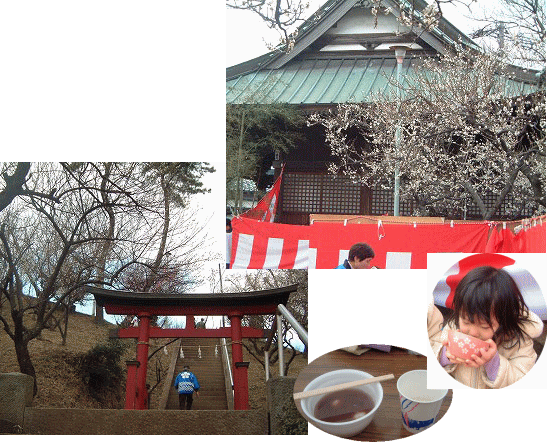 | 東方天満宮の石段はかなり急です。 息を切らしながら上り詰めると前日の 静かな雰囲気とは違っていました。 まず、青いはっぴを着た東方町町内会の方から、期待通りおしること甘酒が振舞われていました。 そして境内にはいすとテーブルが用意され、大勢の方が梅の花を見ながらお汁粉などを食べていました。 社の脇では野点の準備が。。「是非お茶を飲んでいってください。おいしいお菓子も用意しています」との声に誘われ、お茶席に座りました。 お抹茶初挑戦の子供とともに、昔少しだけ習ったことのあるお茶のお手前を思いだしながら、うぐいすの形をした和菓子とお抹茶をいただきました。 味はもちろん、目でも楽しむことができる本当においしいお菓子でした。 |