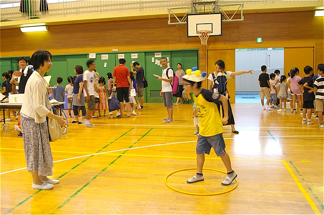このイベントの人気の高さが窺い知れます。この日のためにイベント企画を練り上げてきた、おやじの会の池上代表からイベント説明や暑さ対策などの諸注意の後ドッヂビー(校庭)・遊び広場(体育館)・お化け屋敷(校舎)へと進み、締めくくりとして校庭でナイアガラの滝を思わせる花火が打ちあがり子供達にとって、良き夏の思い出の1ページになったことでしょう。